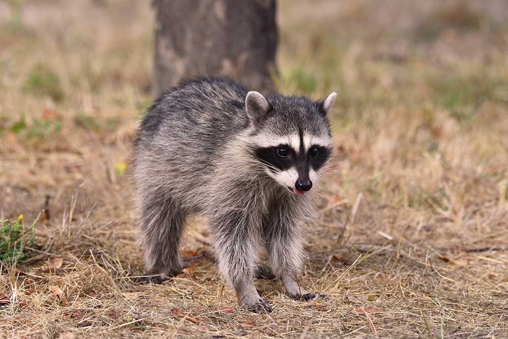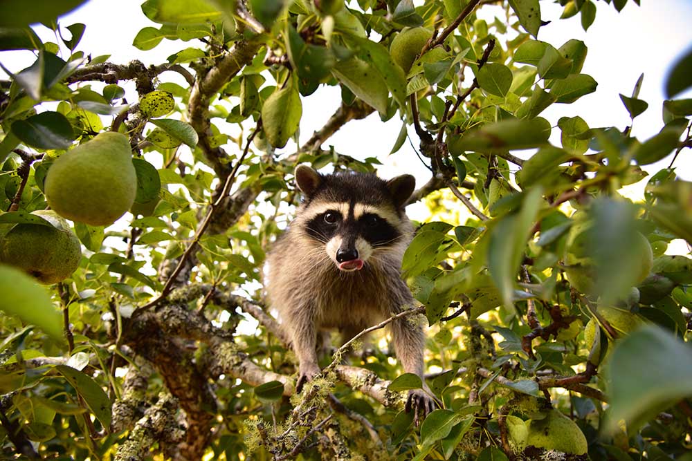 Racoon in Pear Tree . California Coastal Raccoon in Pear Tree